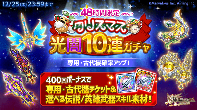 さらに、400回目のボーナスで「伝説・英雄武器スキル素材(全属性) チケット」と「専用・古代機 チケット」が手に入る!