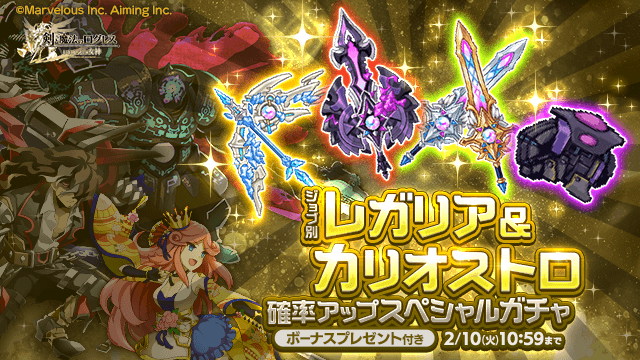 「レガリア」と、期間限定武器「カリオストロ」が、古代機鋼兵/デスペラード/剣姫のジョブ別で確率アップ!