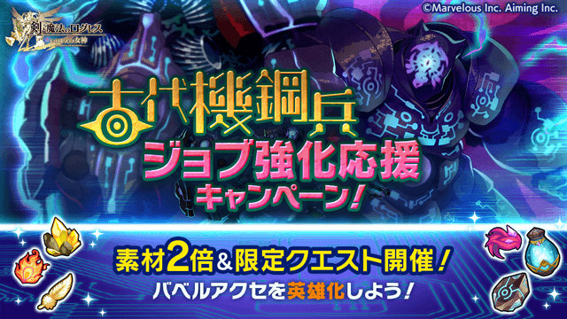 期間中、獲得素材2倍や限定クエストが登場する「古代機鋼兵 ジョブ強化応援キャンペーン!」を開催します。